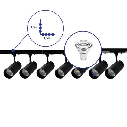 Beschreibung Komplettset 1-Phasen Rail L 1,5 x 1,5 Meter Schwarz | incl. 7x Spot + GU10 2700K 3W Dimmbar + Abschlusskappe, Stromanschluss und L -Verbinder