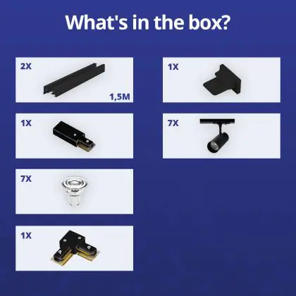 | Herstellername | Complete L shaped 1-Phase Track Set Black incl. 7x Spot fixture + GU10 2700K 3W Dim – 1,5 x 1,5 mete | |