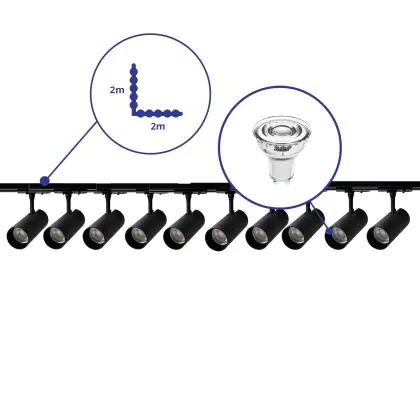 Beschreibung Komplettset 1-Phasen Rail L 2 x 2 Meter Schwarz | incl. 10x Spot + GU10 2700K 3W Dimmbar + Abschlusskappe, Stromanschluss und L -Verbinder
