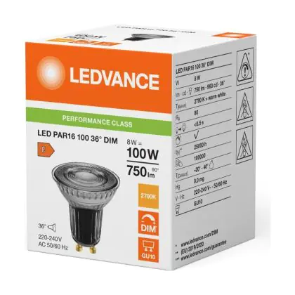 Die Ledvance LED PAR16 GU10 Reflektor 8W 750lm 36D - 827 Extra Warmweiß | Dimmbar Ersatz Für 100W ist eine effiziente GU10 LED-Lampe und der perfekte Ersatz für Ihre konventionelle Halogenlampe mit 100W und einem GU10-Sockel, bei welchem die zwei Stifte einen Abstand von 10 mm zueinander haben. Zudem strahlt das Produkt Licht in der Farbtemperatur 2700K - Extra Warmweiß aus und punktet durch eine lange Lebensdauer.