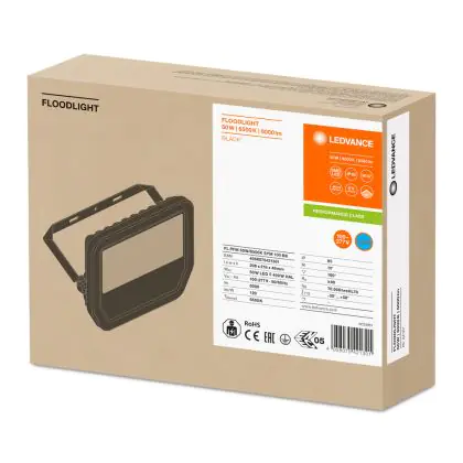 Der Ledvance LED-Scheinwerfer Performance 50W 6500K 6000lm IP65 Schwarz | Symmetrisch | Wasserdicht ist in stilvollem Schwarz gehalten und hat einen sehr niedrigen Energieverbrauch von nur 50 Watt. Dank der hohen Robustheit kann die Leuchte problemlos in Außenbereichen eingesetzt werden.