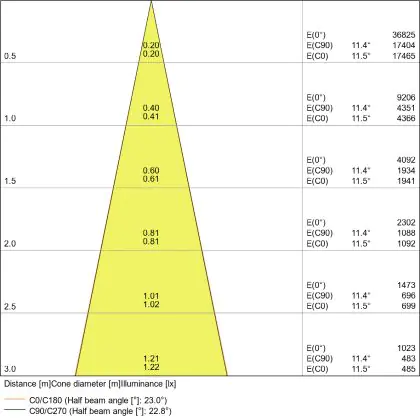 Beispiel: Wird eine Lampe mit einem Abstrahlwinkel von 60 Grad an der Decke (2,5 m Höhe) angebracht, erzeugt sie einen Lichtkegel von 2,9 Metern Durchmesser. Hat die Lampe hingegen einen Abstrahlwinkel von 120 Grad, beträgt der Lichtkegel 8,7 Meter im Durchmesser. |