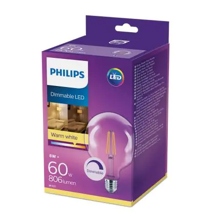 Die Philips Classic LED Globe E27 Fadenlampe Klar 120mm 8W 806lm - 827 Extra Warmweiß | Dimmbar - Ersatz für 60W ist eine effiziente E27 LED-Lampe mit Retrodesign und der perfekte Ersatz für Ihre konventionellen 60W Lampen mit E27. Zudem strahlt sie Licht in der Farbtemperatur 2700K - Extra Warmweiß aus und punktet durch eine lange Lebensdauer.