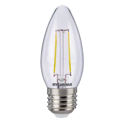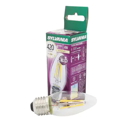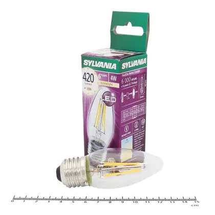 Die Sylvania ToLEDo Retro Candle E27 ist eine moderne LED-Lampe mit Retro-Design. Ihr Verbrauch beläuft sich auf 4 Watt, während sie Ersatz für eine traditionelle Lampe von 40 Watt bietet. Damit sparen Sie ca. 90 % Ihrer sonstigen Energiekosten ein. Die LED besitzt einen E27-Sockel und eine Kerzenform. Sie spendet extra warmweißes Licht mit einer Farbtemperatur von 2.700 Kelvin.